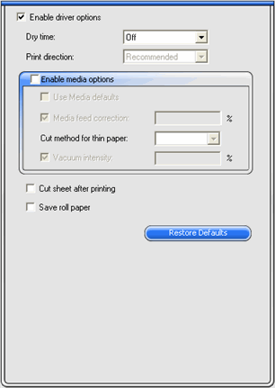 Permite usar as opções de driver disponíveis para seu dispositivo de saída. Quando as opções do driver são ativadas, é possível designar opções especiais dentro do diálogo de opções do driver. Quando as opções do driver são desativadas, as configurações da própria impressora são utilizadas. |